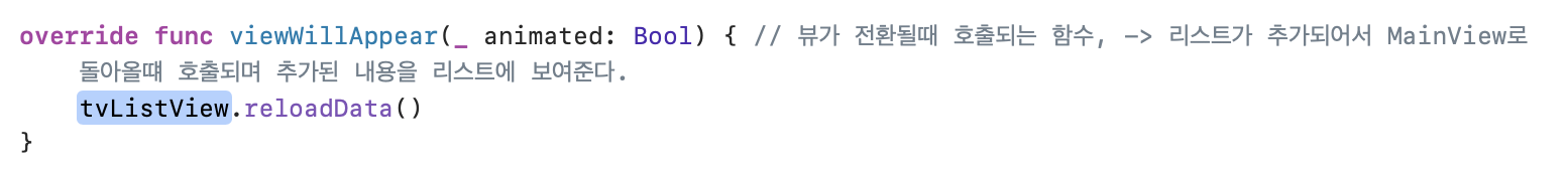 Todo list를 만들면서 만든함수이다. AddViewController라는 뷰컨에서 루트 뷰컨의 정보를 변경하고, pop하면 viewWillAppear 함수에서 tableview의 정보를 변경하고 뷰가 나타난다.