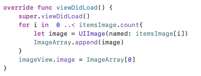 viewDidLoad에서 UIImage의 배열에 이미지를 넣고, 처음보이는 이미지에 ImageArray의 첫번째 이미지를 보여주게 만드는 것이다.
