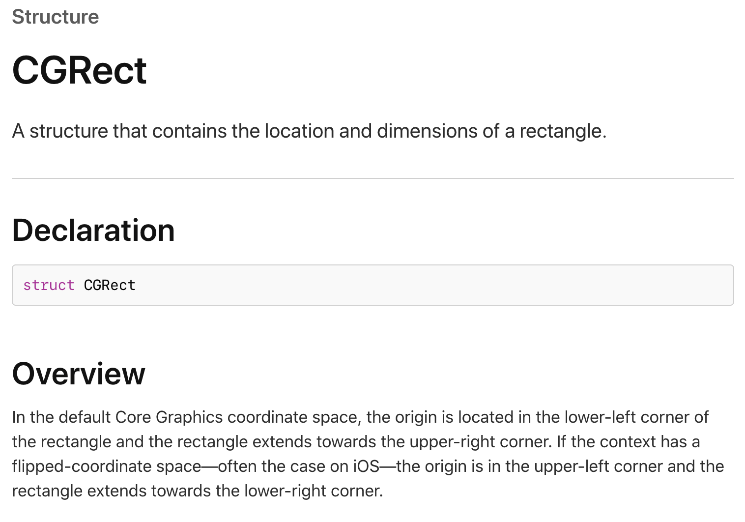 정의는 사각형의 위치와 크기를 포함하는 구조체이다. CGRect는 CGSize와는 다르게 사격형이다. 이렇기 때문에 원점과 가로(너비)와 세로(높이)를 다 정해줘야한다.